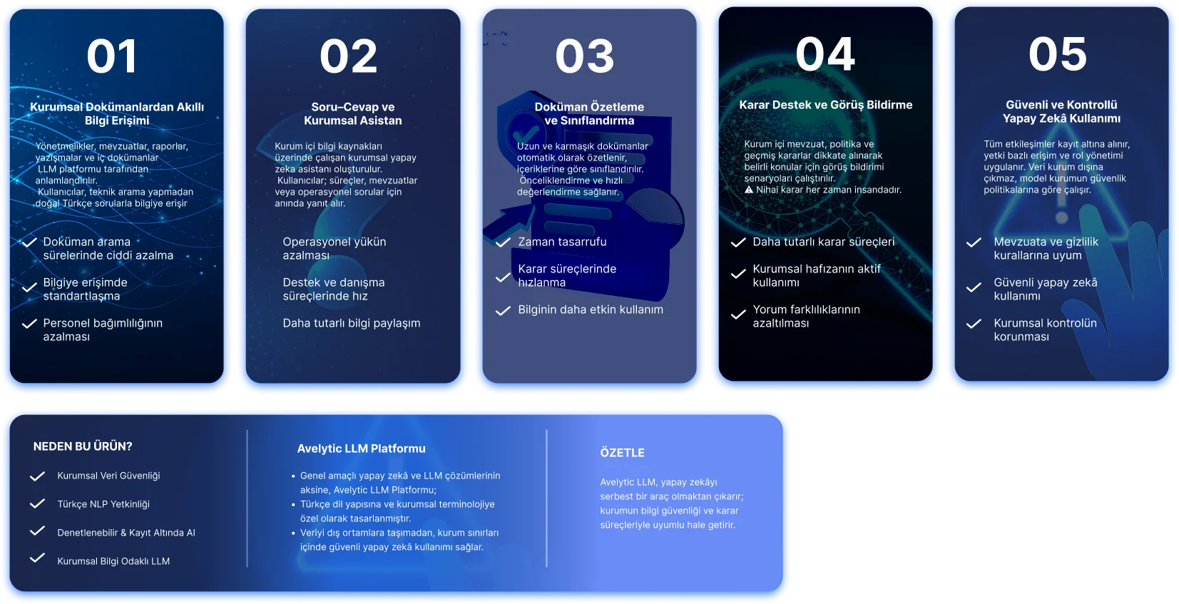 Özetle: Avelytic LLM, yapay zekâyı serbest bir araç olmaktan çıkarır; kurumun bilgi güvenliği ve karar süreçleriyle uyumlu hale getirir.