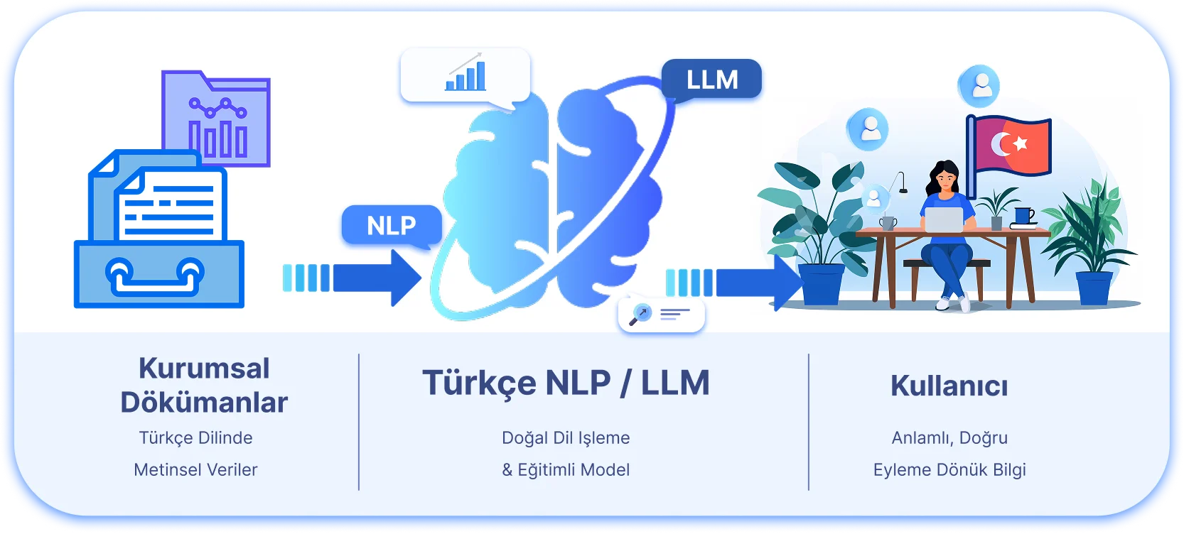 Yönetmelikler, mevzuatlar, raporlar, yazışmalar ve iç dokümanlar LLM platformu tarafından anlamlandırılır ve indekslenir. Kullanıcılar, teknik arama yapmadan doğal Türkçe sorularla bilgiye erişir.